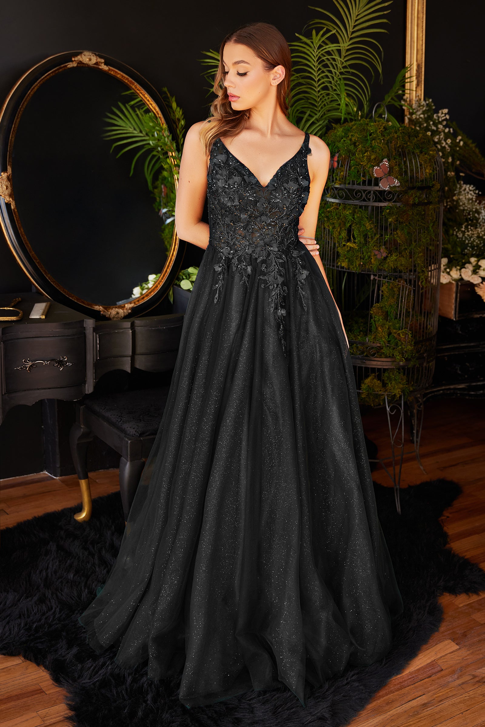 Lace 3D floral A-line dress. This whimsical A-line gown is cut from layered tulle and embellished with a floral beaded lace and three-dimensional flowers blooming from the bodice. This fairytale gown has a v-neckline and open swoop back.