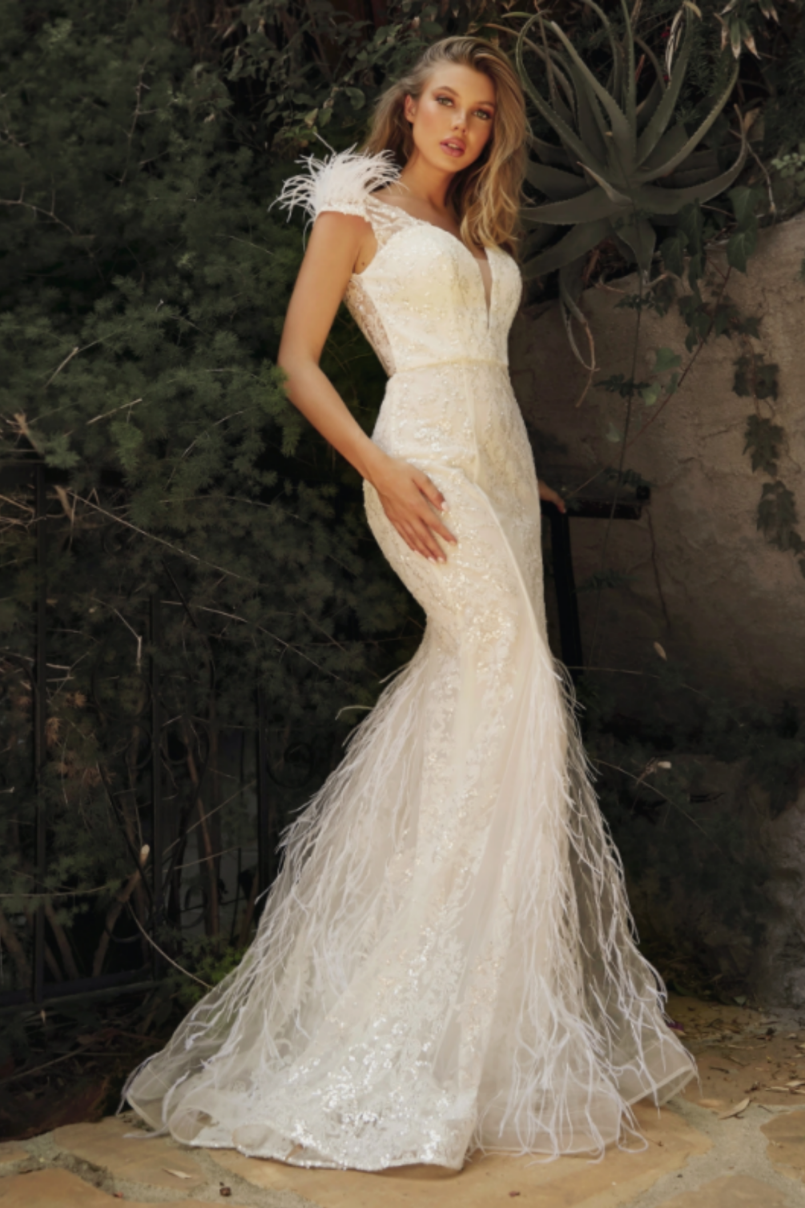 Embellished mermaid feather bridal gown.